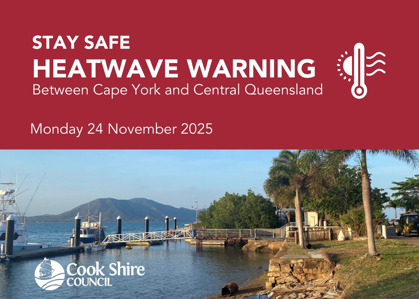 Cook Shire Council is advising residents that severe to extreme heatwave conditions are forecast for Far North Queensland over the coming days, with the Bureau of Meteorology warning that temperatures will continue to rise across the region from Monday 24 November through to Wednesday 26 November.