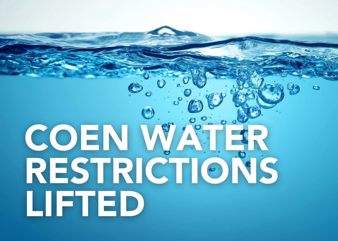 Cook Shire Council advises residents that Level STOP water restrictions in Coen have now been lifted, effective immediately.